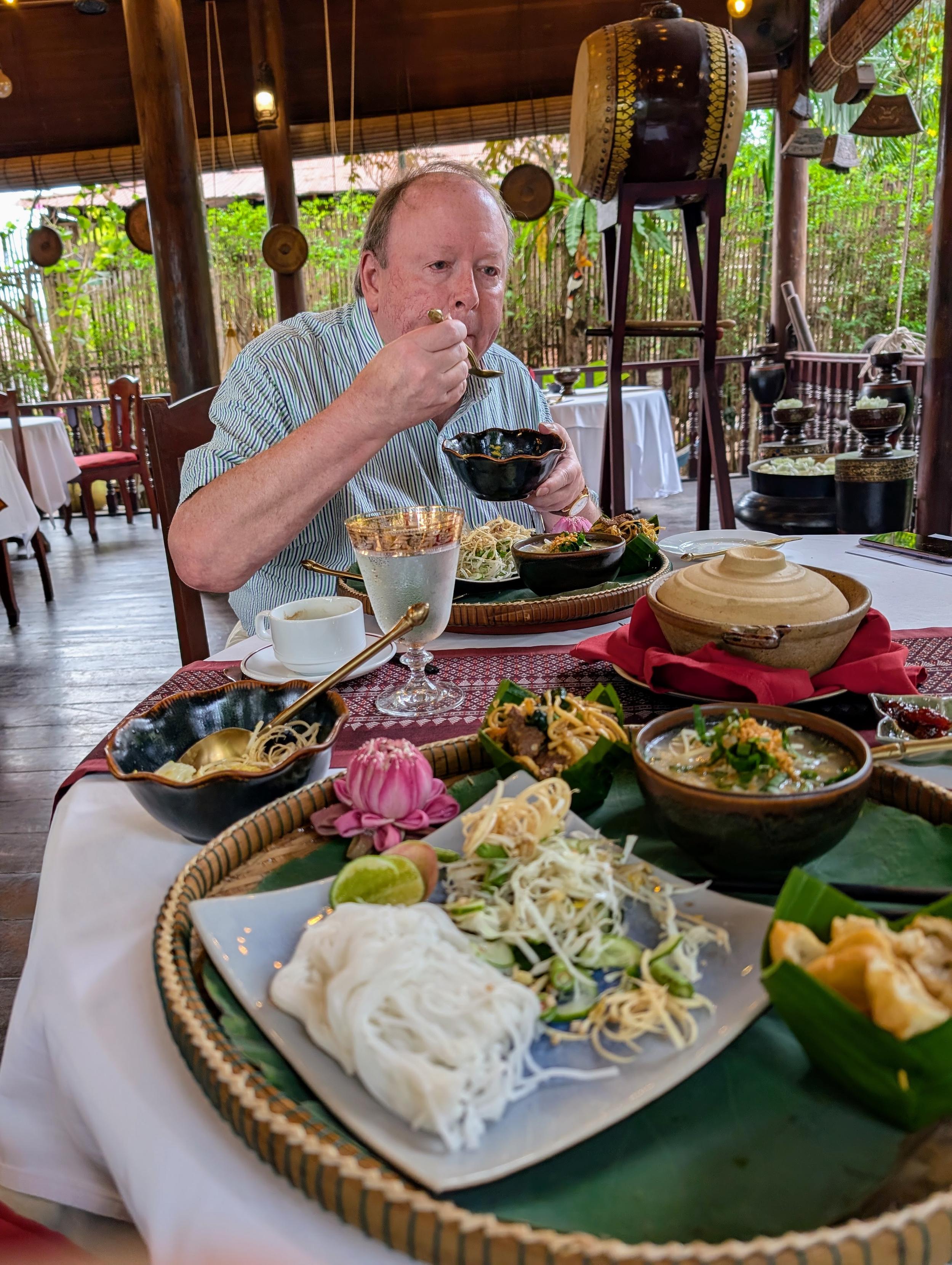 More Cambodian food, breakfast at Sala Kdei near Angkor Wat. My favorite was the Nom Bohn Chok នំបញ្ចុក, rice noodles with fish and coconut broth.