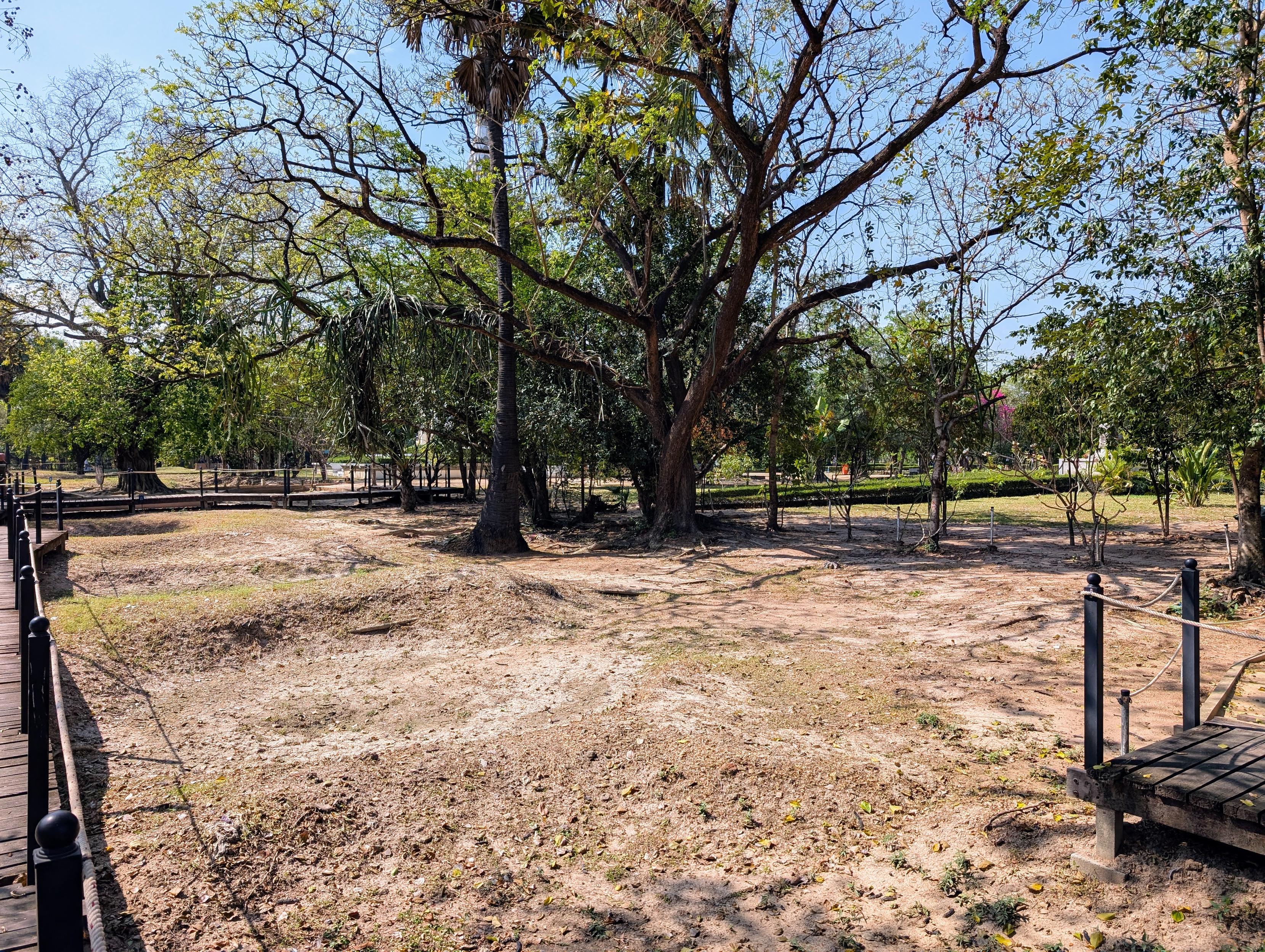 This morning we visited Choeung Ek (ជើងឯក), one of the "killing fields" from the Cambodian genocide. More of a memorial than an interpretive museum, it has the feeling of a rough open grave. They've left many bones in the ground, scattered on the surface. Skulls of victims are collected respectfully in a central stupa.