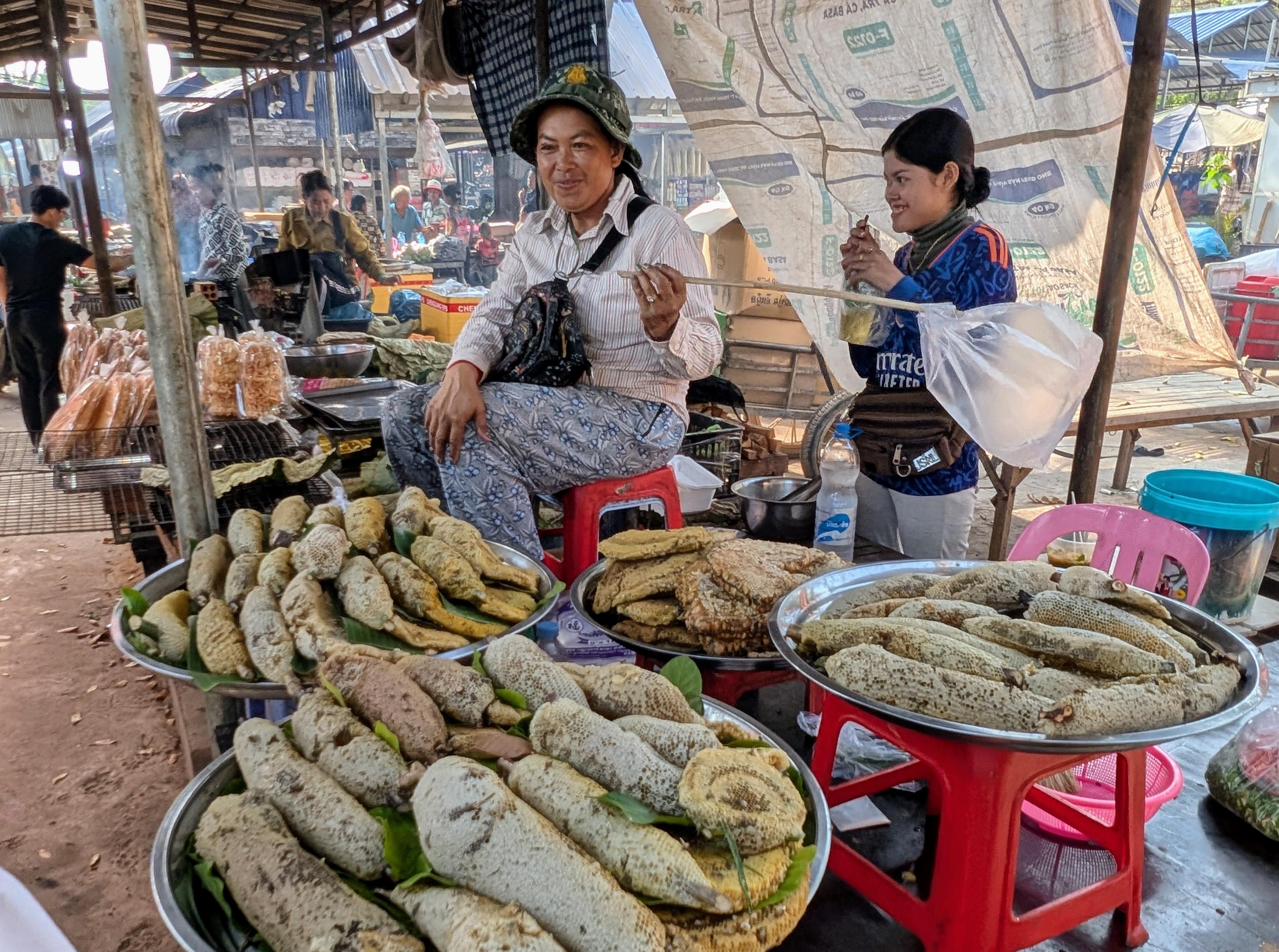 Some commerce photos. In Koh Chen they make hammered metalwork, this one is a copper bowl. And Udong is a domestic tourist site so it has a market selling all sorts of delicious snacks for daytrippers.
